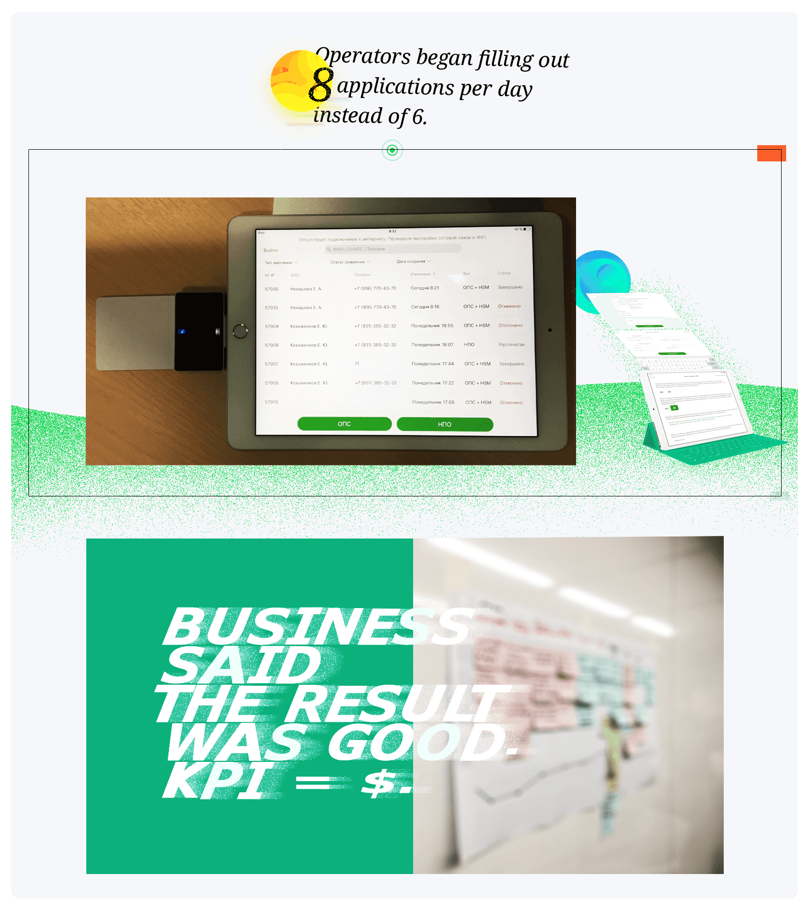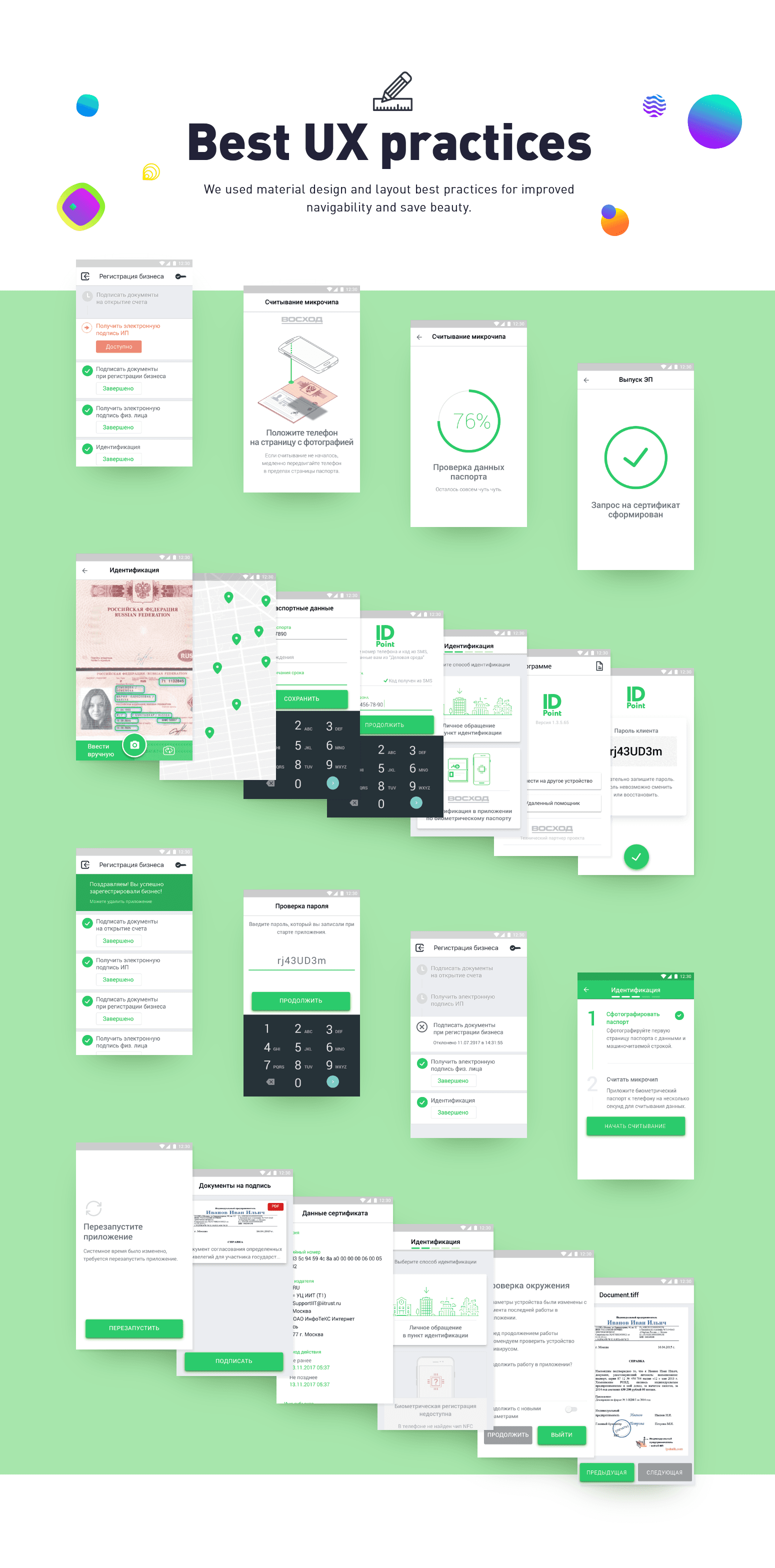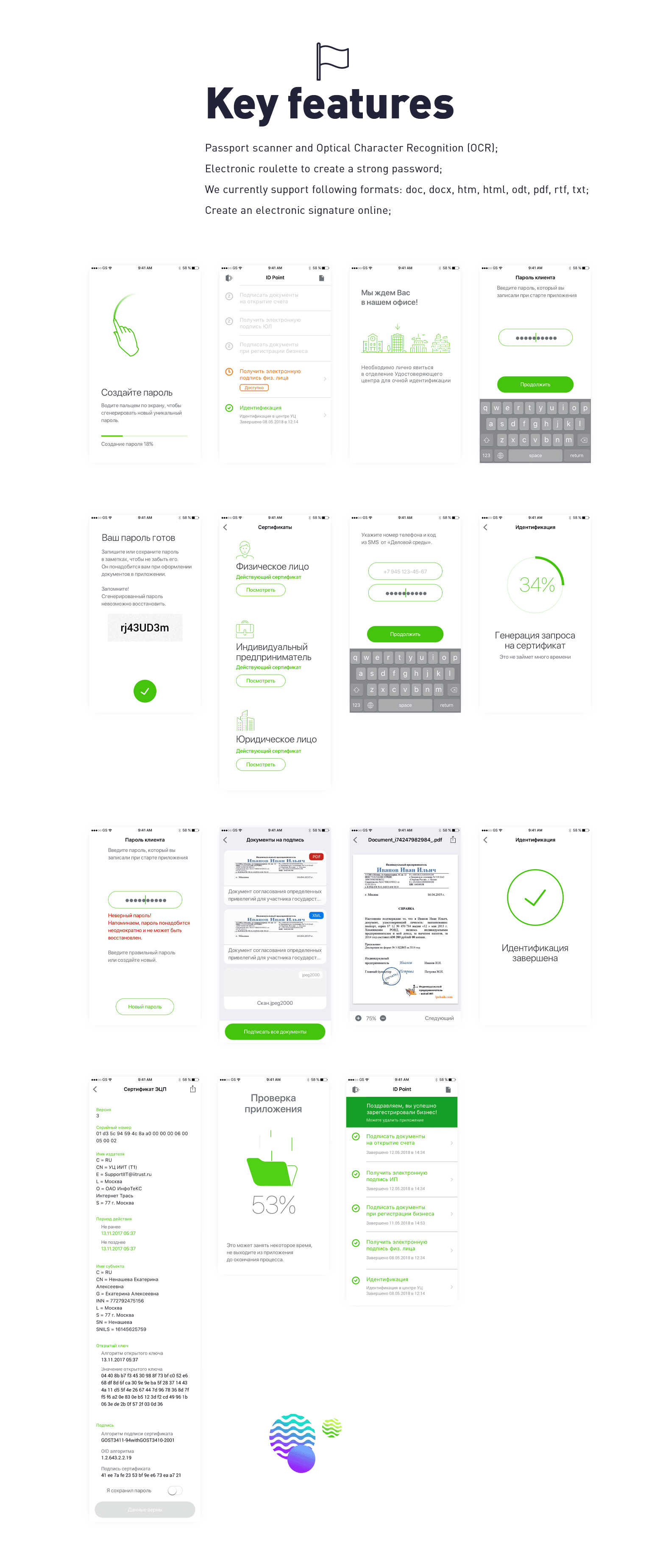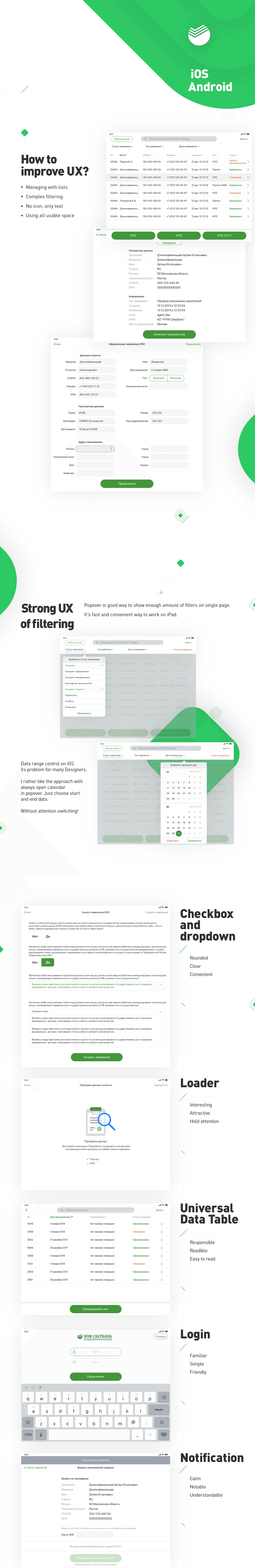 There are three projects for biggest bank in Central and Eastern Europe, it’s Sberbank. Mobile workplaces for work «in the field» and remote business registration for iOS and Android. It’s hard to explain all process, because it was not linear. You know, iterates (research, prototype, test, learn some stuff, researched some more, prototyped again, tested again, learned more…).